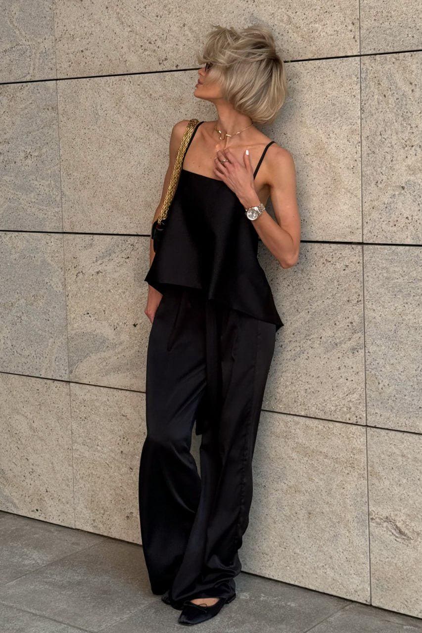 Crafted from Mango silk (97% polyester, 3% elastane), this set offers a soft, weightless drape and a silky sheen that catches the light. It’s breathable, elegant, and ideal for warm-weather wear or layering under a blazer.